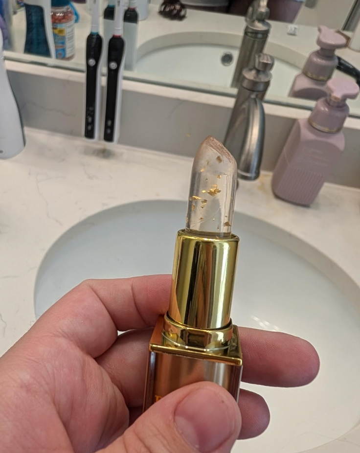 The first thing I noticed was how interesting it looked. Instead of the typical colored lipstick, the balm inside the tube appeared mostly clear with tiny glitter pieces suspended throughout it. It looked more like a glossy lip balm than a traditional lipstick.