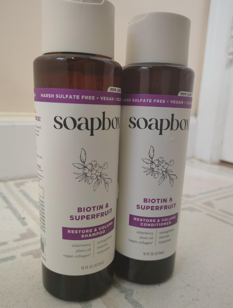 For $19 on Amazon.com, I grabbed two full sets; The Soapbox Biotin & Superfruit and the Soapbox Argan Shampoo. You see, these two were the most talked about on a mom’s forum I belong in.